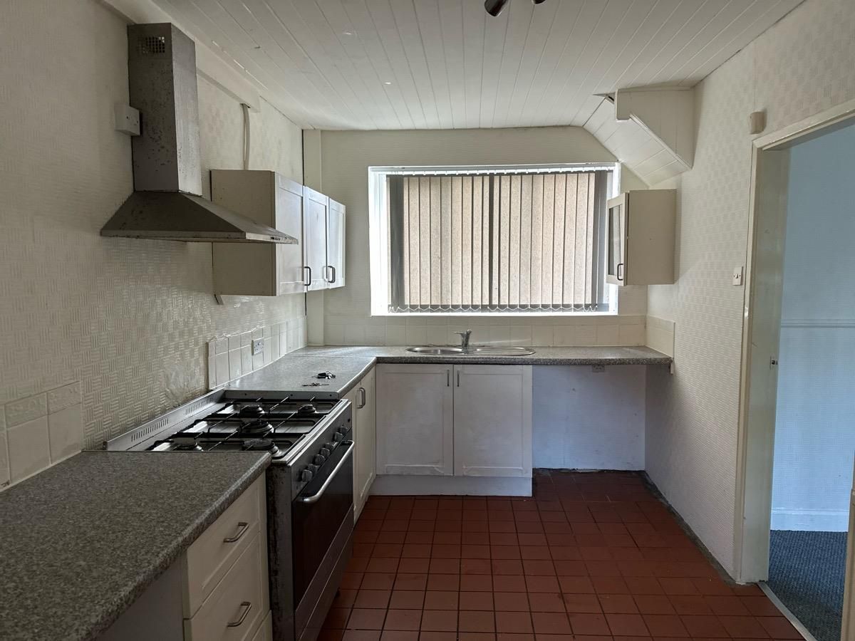 Spacious kitchen benefits from the tiled flooring, painted walls, double glazed window with blinds, range cooker and pending light fitting.