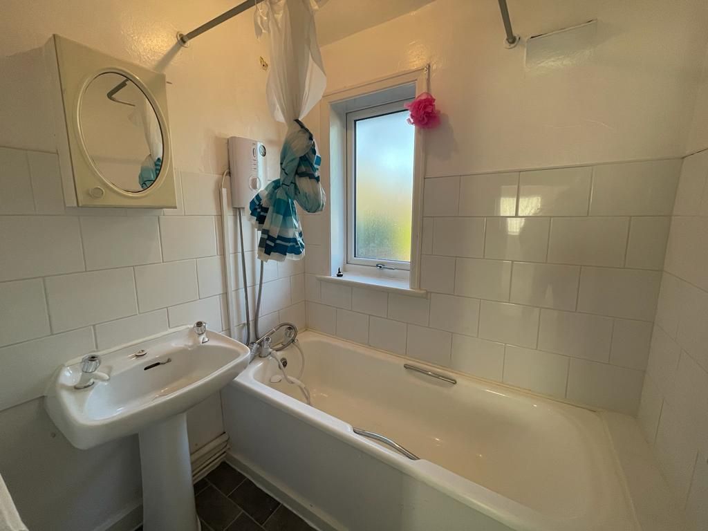 With vinyl to the floor, panel bath with electric shower over, pedestal hand washbasin.